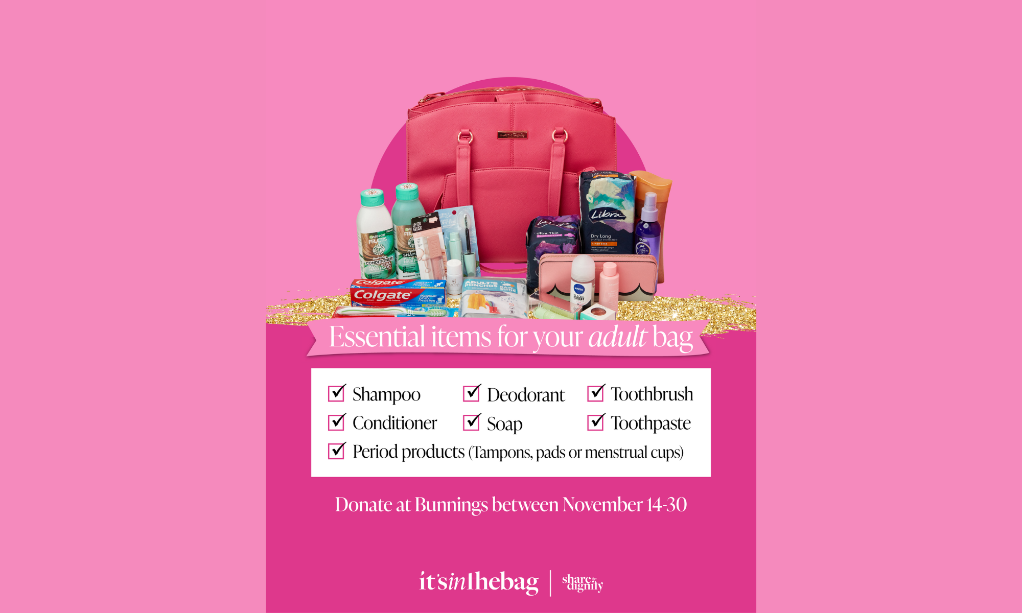 Fill a new bag or a pre-loved one (in excellent condition) with life’s essentials and a few luxury items to help someone in need.